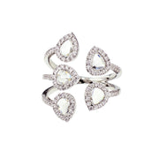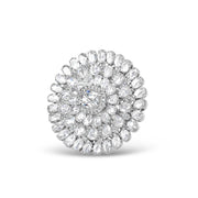 The central oval-shaped diamond fashioned in a rose cut is surrounded by assorted small, oval, rose-cut stones to shape the piece into a majestic flower that sits snug and elegant on your finger.