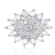 The central oval-shaped diamond fashioned in a rose cut is surrounded by assorted small, oval, rose-cut stones to shape the piece into a majestic flower that sits snug and elegant on your finger.